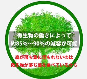 自然に生息する微生物の働きを利用したバイオ資材『バイオテック・ユーノサ』の生ゴミ分解の力。これを利用したのが食品資源リサイクル機器『マジックバイオくん』です。生ゴミに含まれる有機物を水蒸気と炭酸ガスなどに分解し、数時間で生ゴミを大幅に減容。毎日発生する大量の生ゴミも、効率よく処理できます。 バイオ資材をセットした槽内に食品資源を投入し、撹拌しながら資源の大部分を水蒸気と炭酸ガスに分解し、大幅な減容化が図れます。 食品資源の連日投入が出来、バイオ資材の全交換は1年に1回。 |